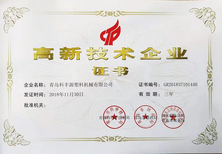 青島科豐源塑料機械有限公司獲得高新技術企業(yè)證書